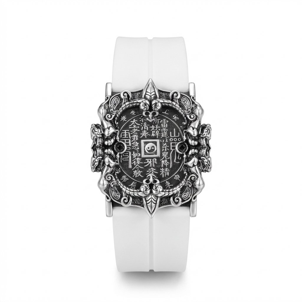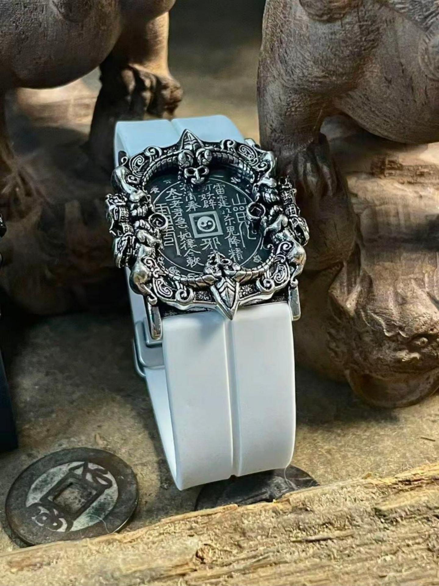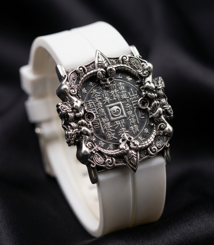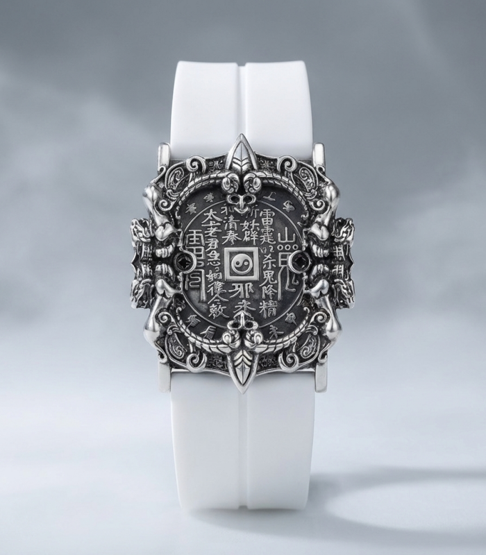 The bracelet features a unique shape of a mountain spirit copper coin. In the center of the dial, there is a finely crafted mountain spirit copper coin, adorned with exquisite Taoist symbols. Surrounding it are intricate dragon patterns. The overall design is simple yet mysterious, with a high degree of recognizability. The combination of silver metal with black and white straps is both modern and retains a traditional charm, highlighting the unique taste of the wearer.