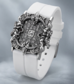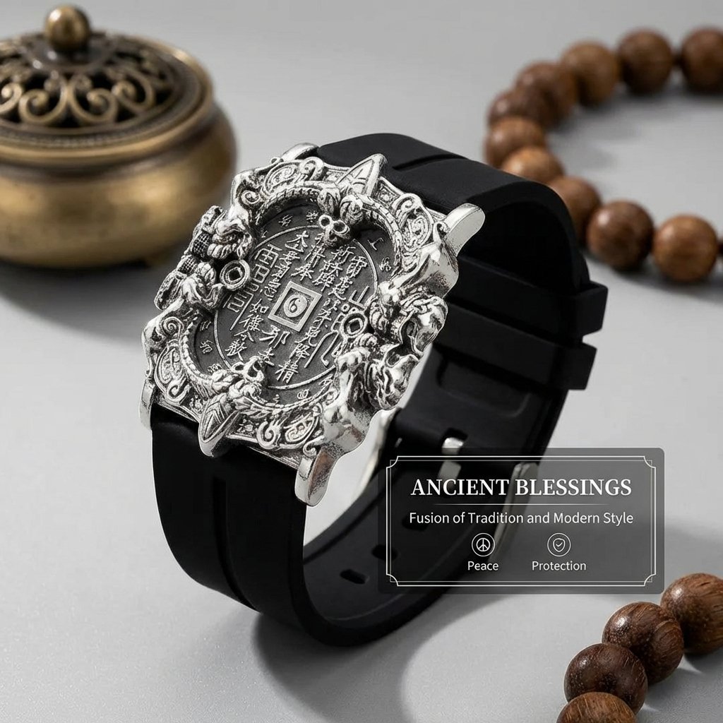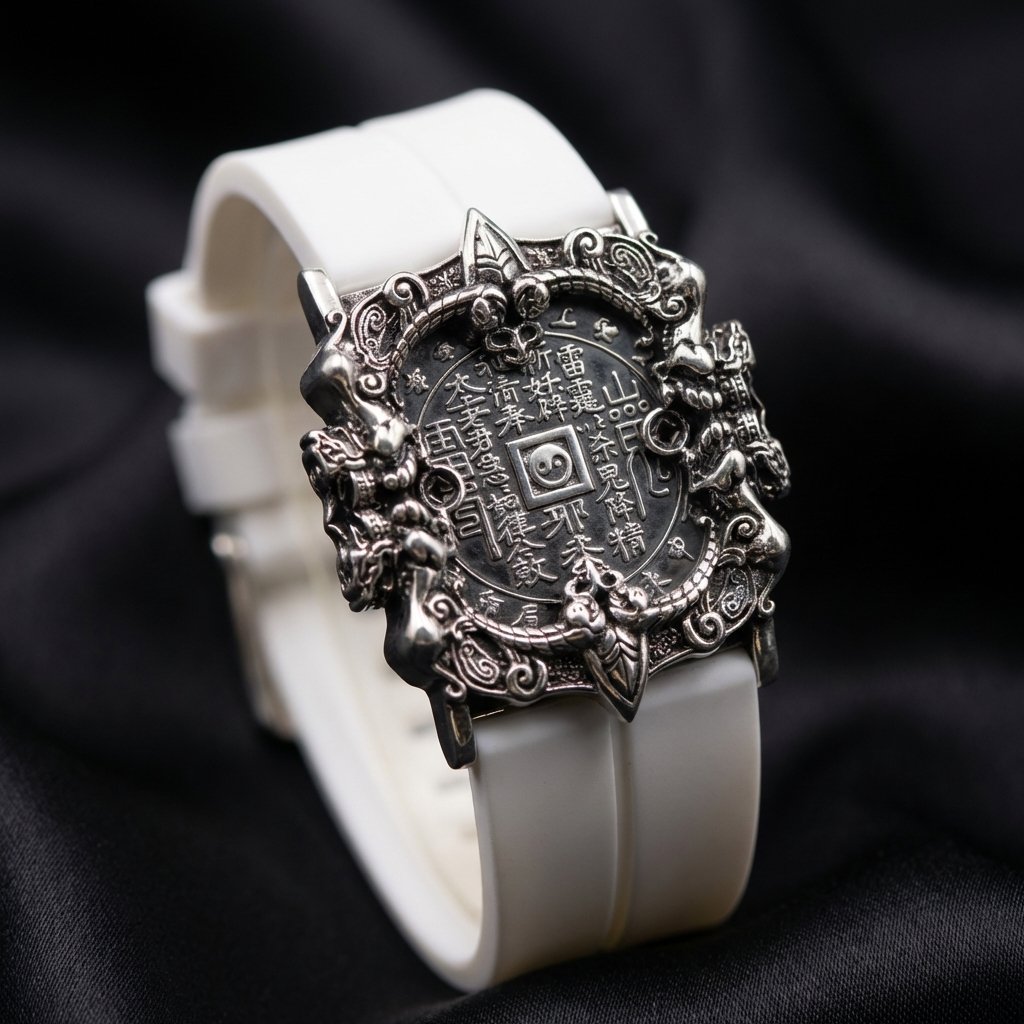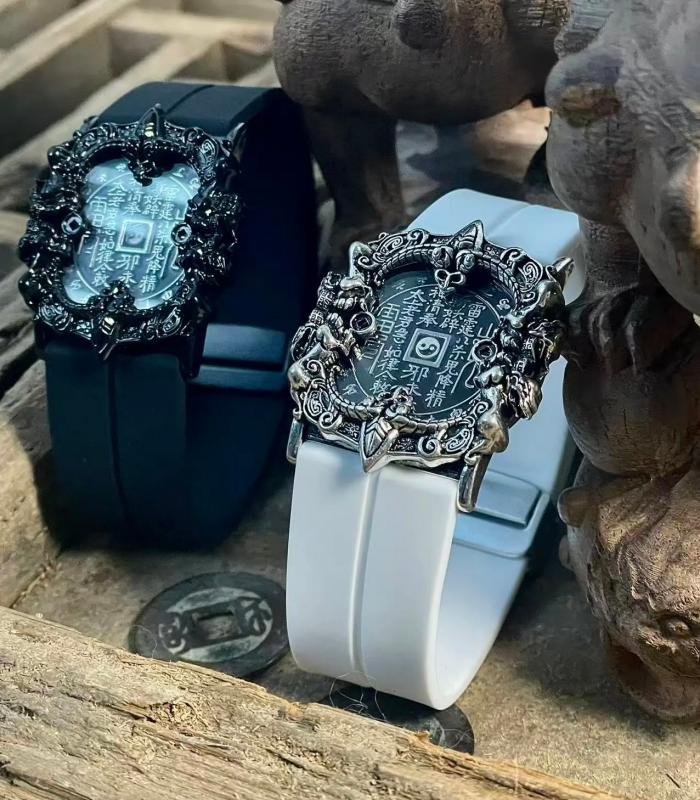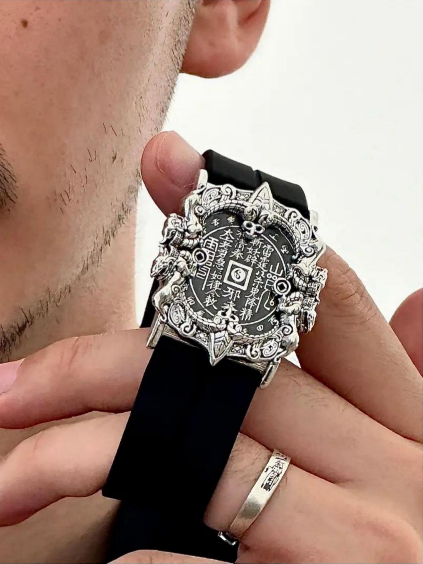 The bracelet features a unique shape of a mountain spirit copper coin. In the center of the dial, there is a finely crafted mountain spirit copper coin, adorned with exquisite Taoist symbols. Surrounding it are intricate dragon patterns. The overall design is simple yet mysterious, with a high degree of recognizability. The combination of silver metal with black and white straps is both modern and retains a traditional charm, highlighting the unique taste of the wearer.
