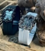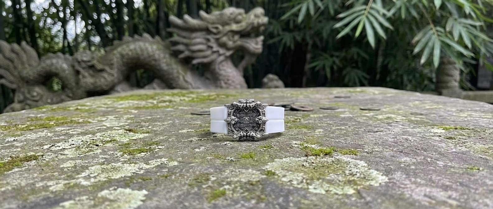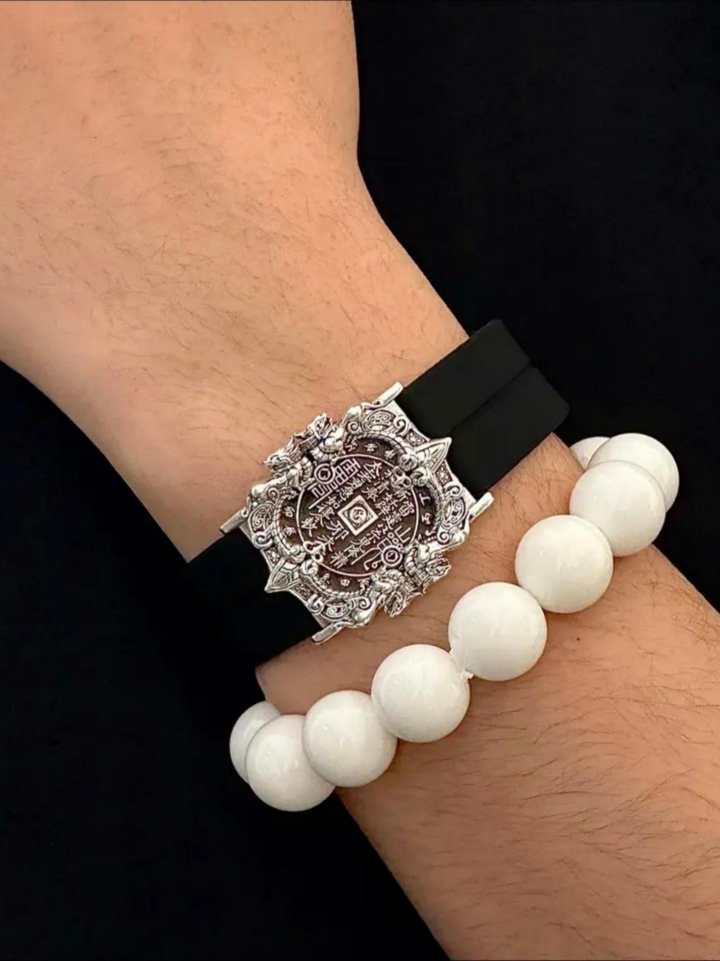 The main material is high-quality silver alloy, and the surface has been finely polished, giving a warm and textured touch. The black and white straps are made of high-quality silicone, which is soft and comfortable, suitable for long-term wearing. Silver alloy not only has excellent corrosion resistance but also carries the auspicious meaning of warding off evil and disasters.
