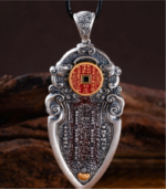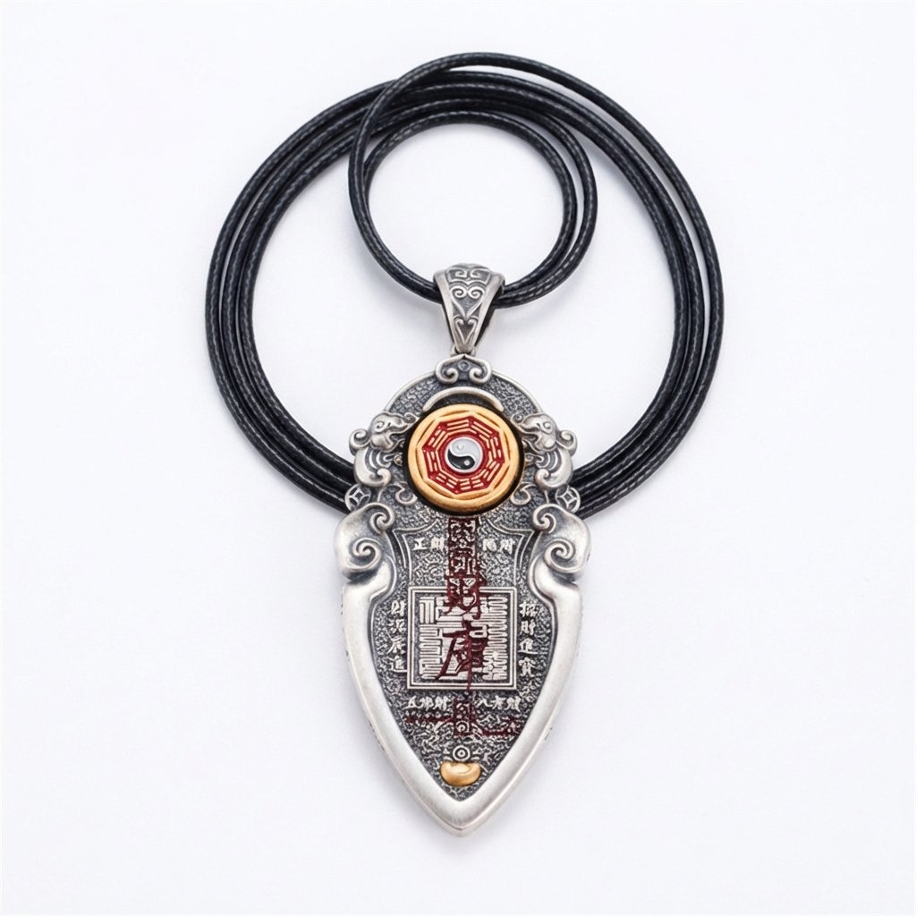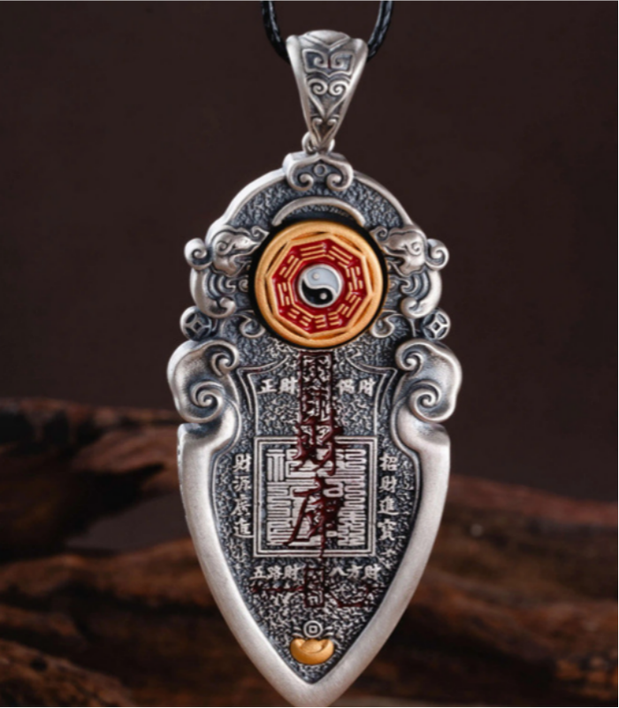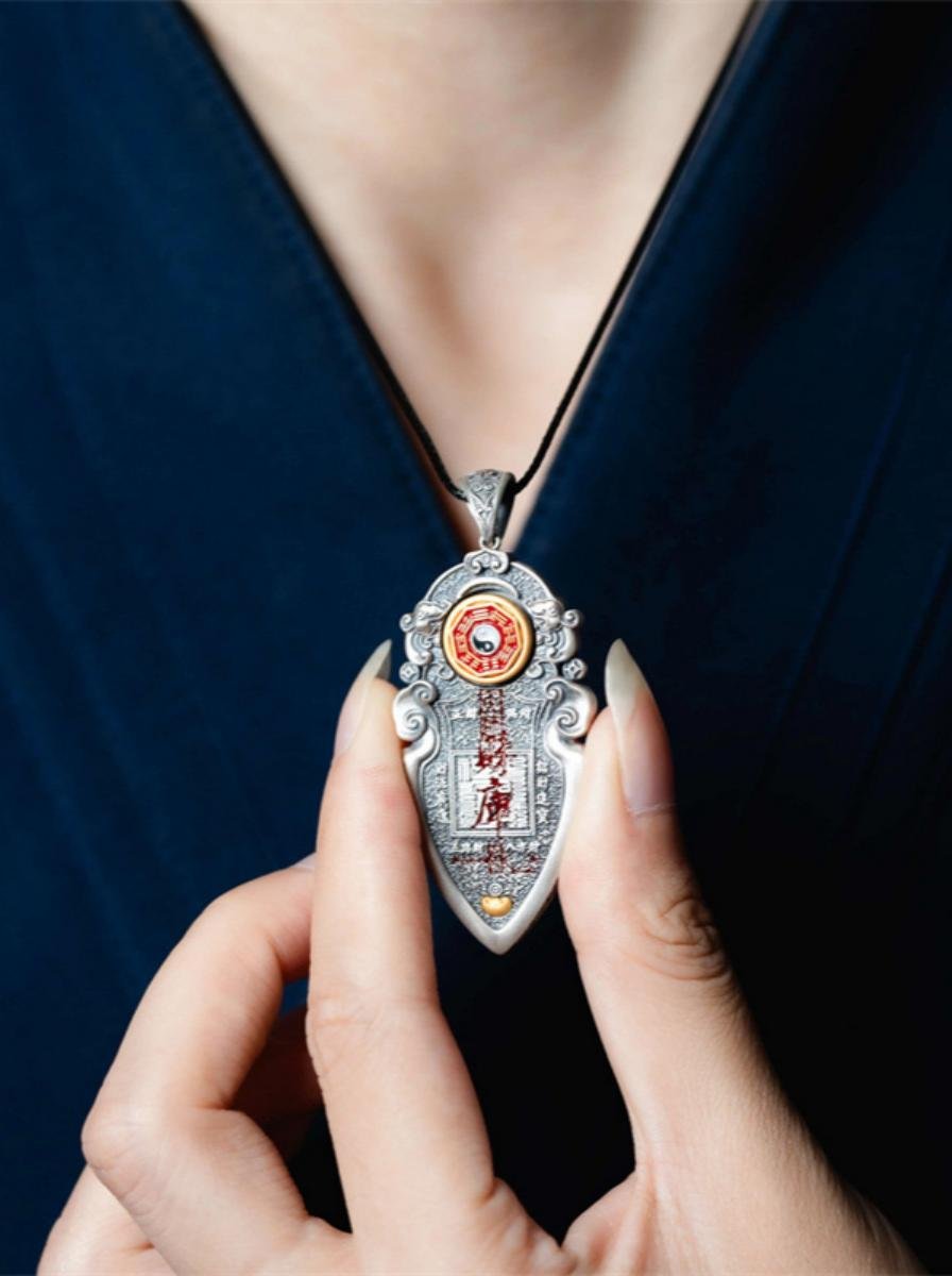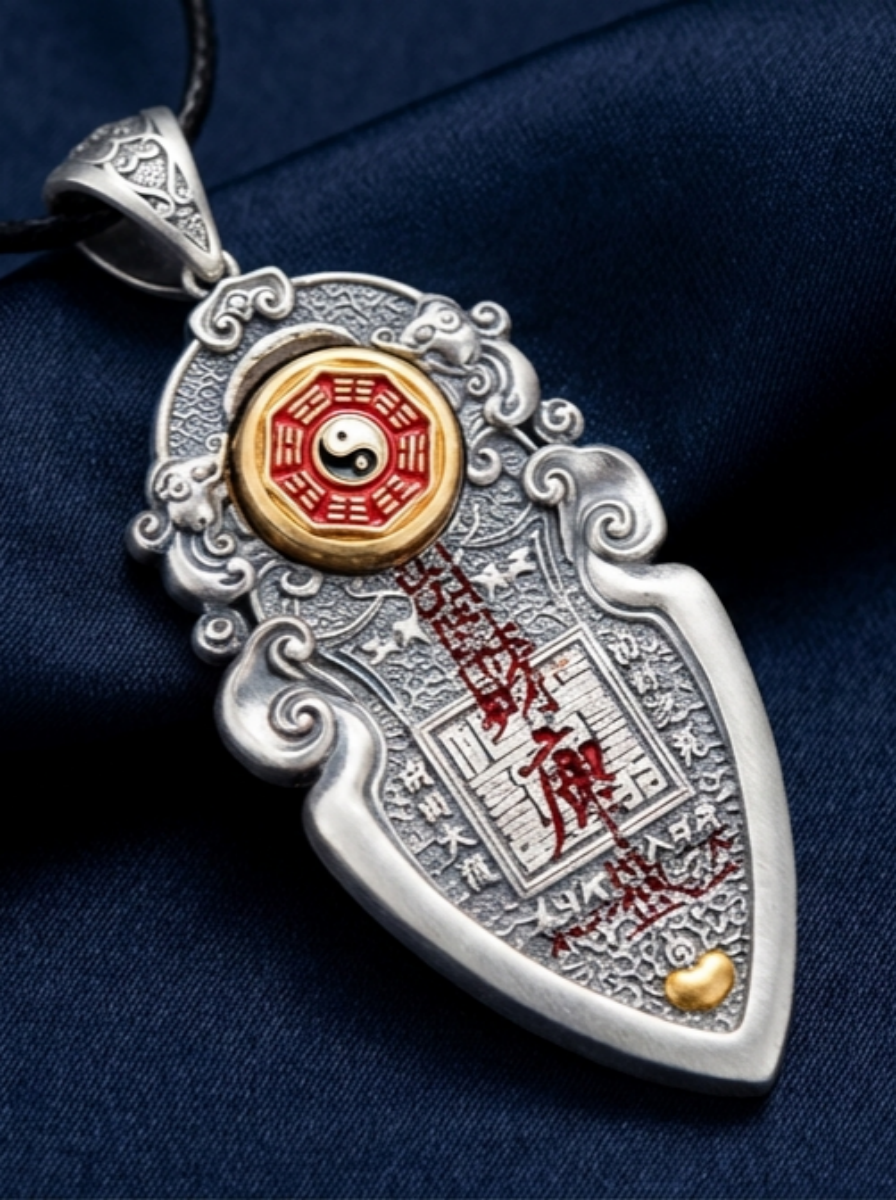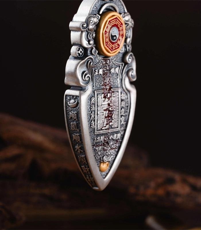 The pendant is entirely in the form of a "Mie Sword", with smooth lines and a sense of tension, combining traditional and modern aesthetics. A Tai Chi and八卦 pattern is set in the center, surrounded by auspicious cloud patterns and elements of mountain spirits and money coins. The details are rich yet not overly complicated, fully showcasing the classical charm. The overall design is clear in layers and has a strong visual impact. It can be used as a talisman and is also a highly valuable work of art with great ornamental value.