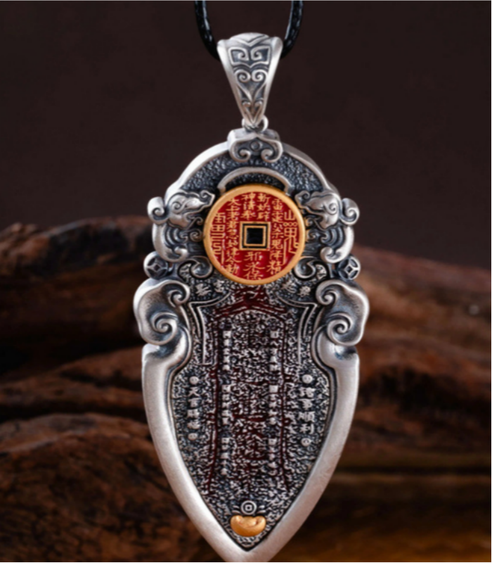 The mountain spirit uses money as a symbol to ward off evil and bring good fortune. The Taoist spells carry the beautiful meaning of driving away evil and disasters and attracting wealth and prosperity. By reinterpreting the "Thunder Department Spells" from Taoism artistically, the lines are like lightning, twisting and powerful. Visually, it creates a dynamic tension, as if energy is flowing on the metal surface. It is suitable for daily wear to pray for peace and prosperity. At the same time, it can also be used as a home decoration item or a decorative piece on the desk, adding a mysterious and solemn atmosphere to the environment.