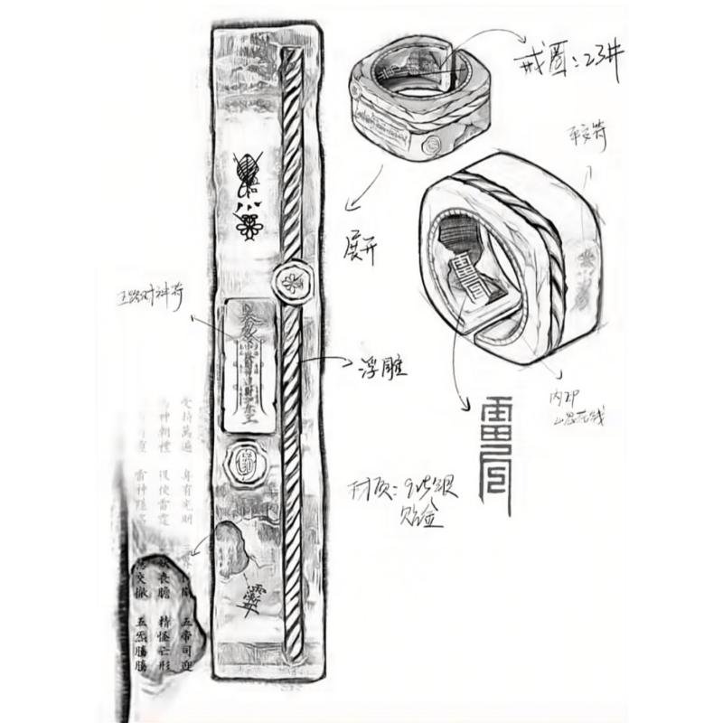 The talisman on the ring is depicted with vermilion ink. The lines of the talisman are ingeniously combined with the geometric structure of "Heaven is round and Earth is square" and the natural imagery of the mountain spirit patterns. It is an indispensable core ritual object in Taoist incantations, exorcism, healing, and blessing and disaster relief. It is not just ordinary text or pattern, but rather a "book of heaven" or "cloud seal" that is believed to be able to communicate with deities, mobilize cosmic energy, and change reality. It condenses the complex Taoist ritual procedures into a small space, making it a portable and continuously effective amulet.