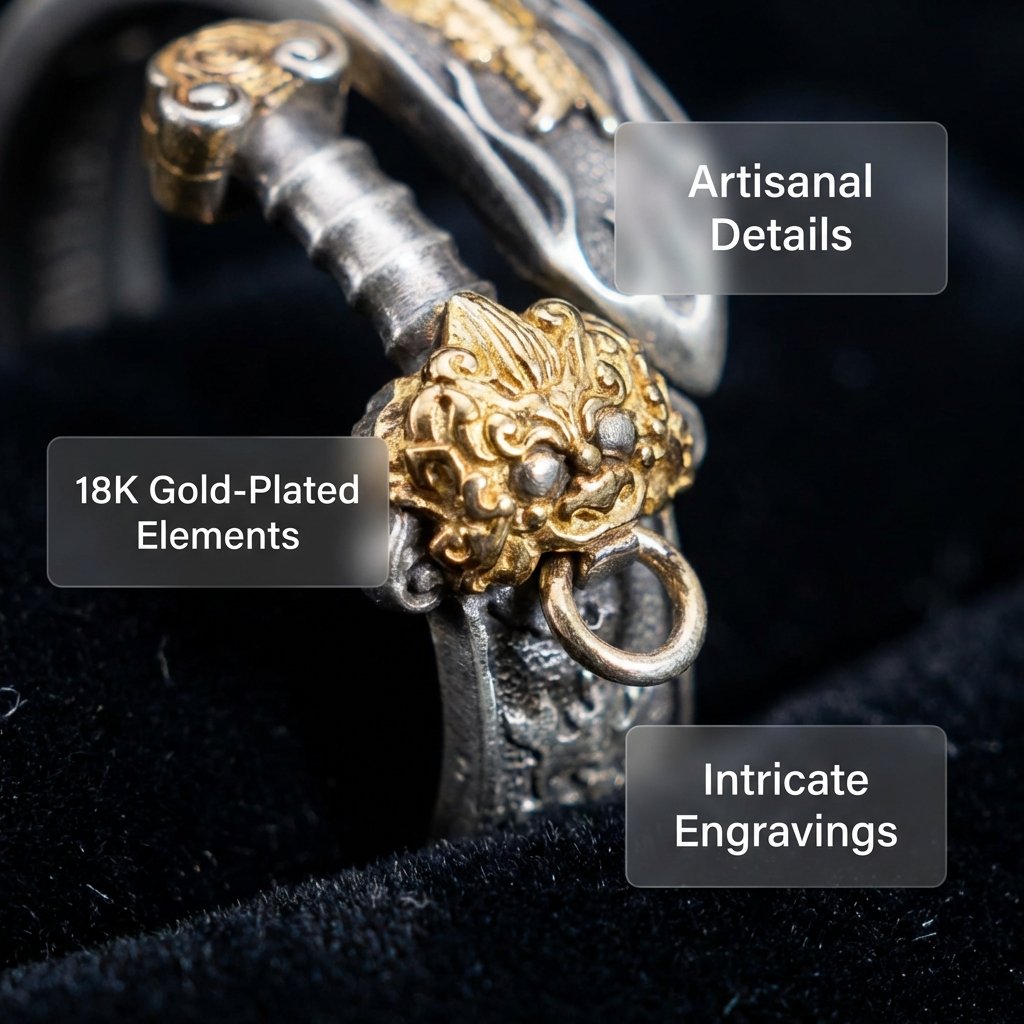 Color Combination: The silver base is complemented by gold decorations, creating a sharp contrast. This not only gives off the coldness of metal but also adds a touch of nobility and sanctity due to the gold plating. Silver symbolizes purity and strength, while gold represents auspiciousness and wealth. This perfectly aligns with the concept of balance of yin and yang in Taoist philosophy.